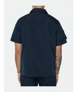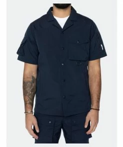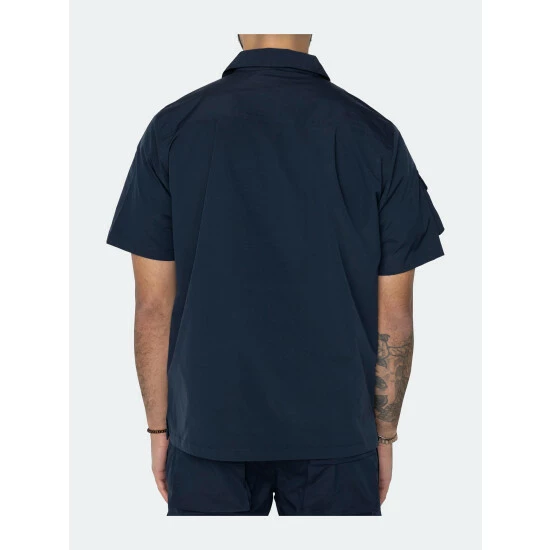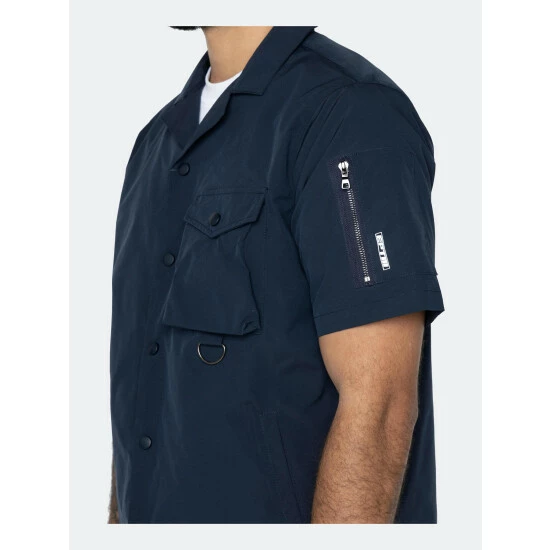 The Snap Button Shirt. This short sleeve shirt features a bowling shirt style collar, snap button front opening, and utilitarian style pockets reinvented in a contemporary way.