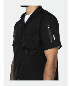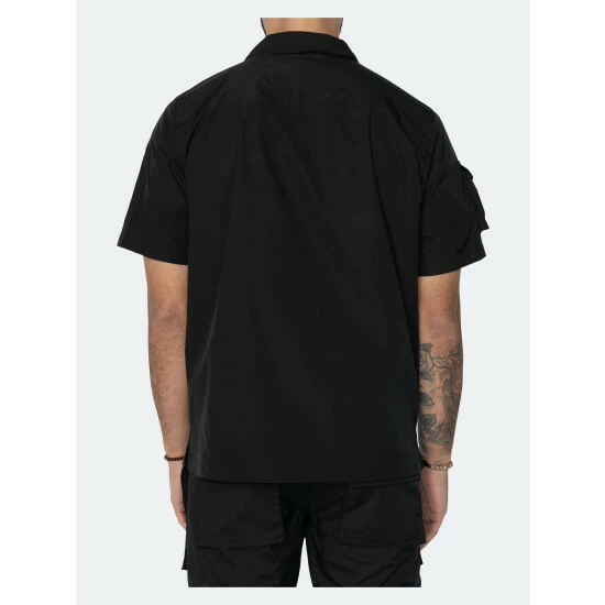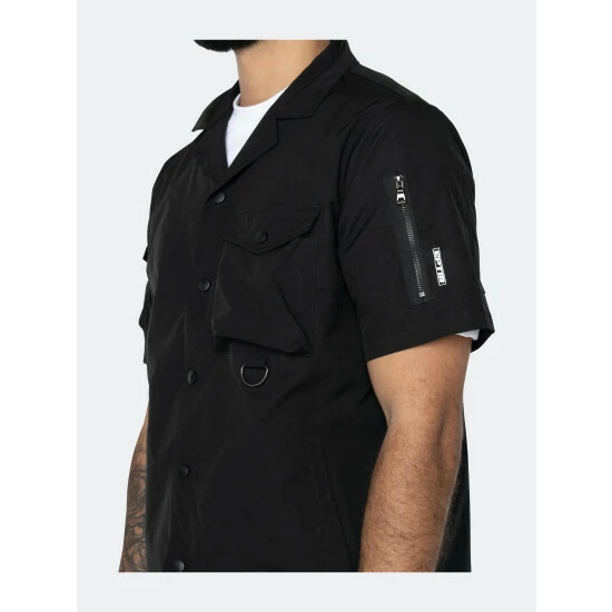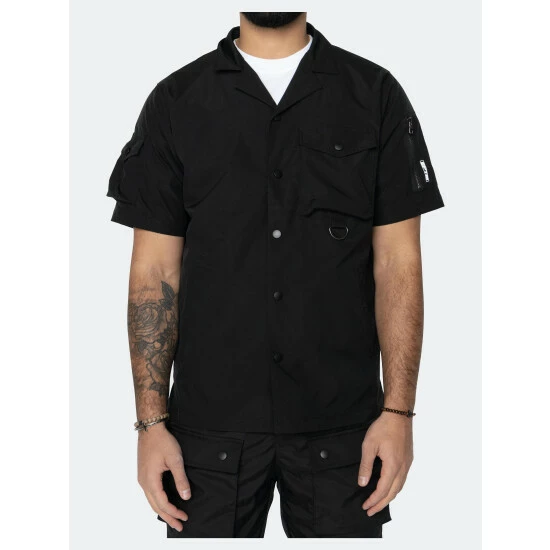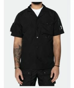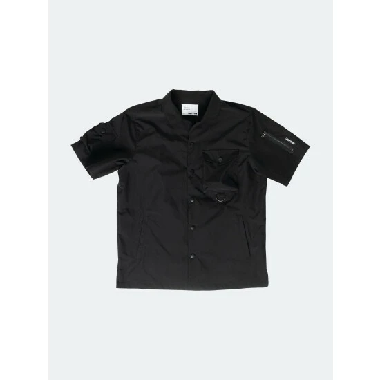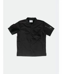 The snap button shirt. This short sleeve shirt features a bowling shirt style collar, snap button front opening, and utilitarian style pockets reinvented in a contemporary way.
