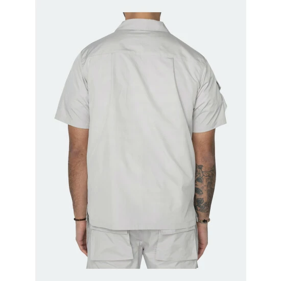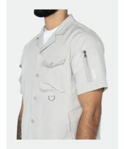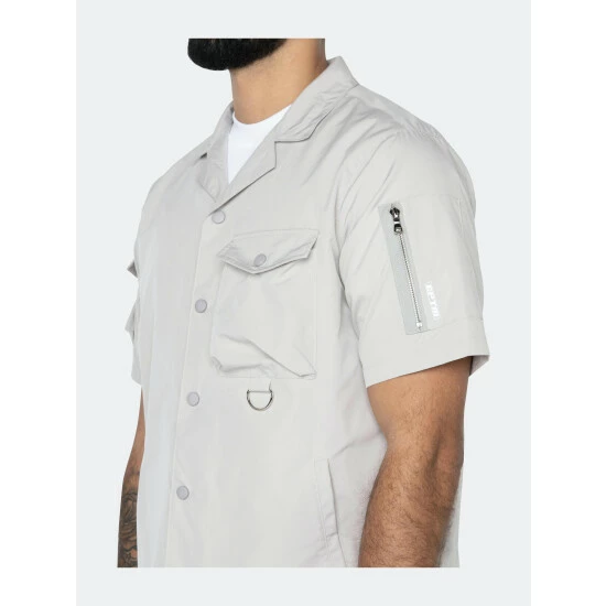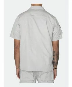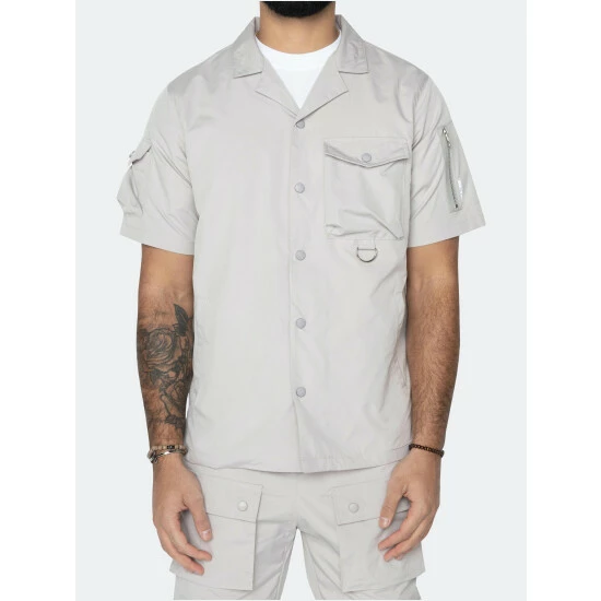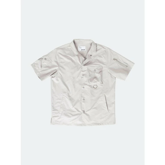 The snap button shirt. This short sleeve shirt features a bowling shirt style collar, snap button front opening, and utilitarian style pockets reinvented in a contemporary way.