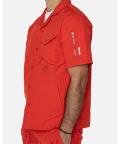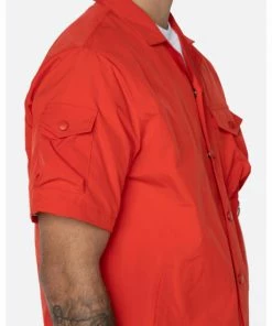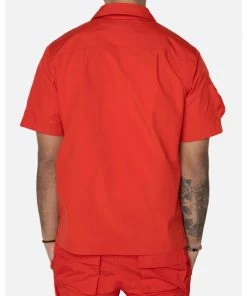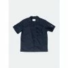 The Snap Button Shirt. This short sleeve shirt features a bowling shirt style collar, snap button front opening, and utilitarian style pockets reinvented in a contemporary way.